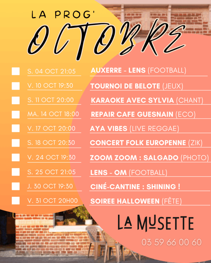 Voici les évènements publics passés et futurs à La Musette :